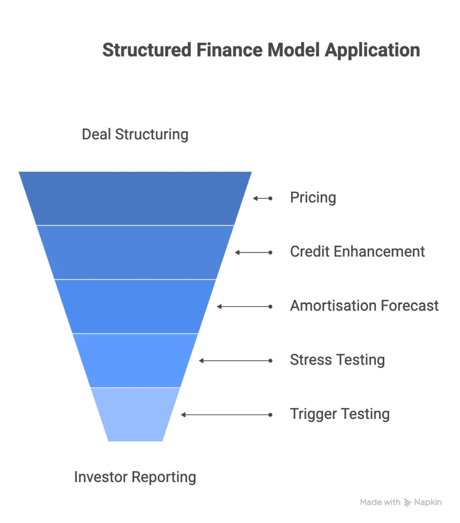 Structured finance modelling sits at the centre of this process. A model takes loan data and deal rules, then projects how cash will behave over time. It shows when investors are likely to get paid, how quickly notes amortise and how much protection each tranche has in different scenarios.